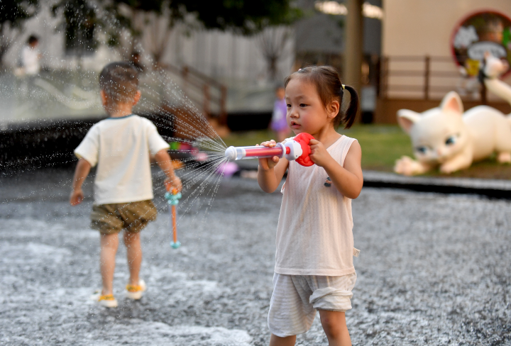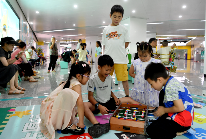 ▲轨道奥体中心站,纳凉的小朋友一起玩耍。
