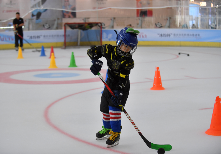 ▲万象城溜冰场,小朋友正在进行冰球训练。