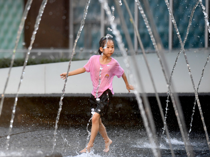 ▲万象城古树广场,小朋友尽情展示“水中芭蕾”。