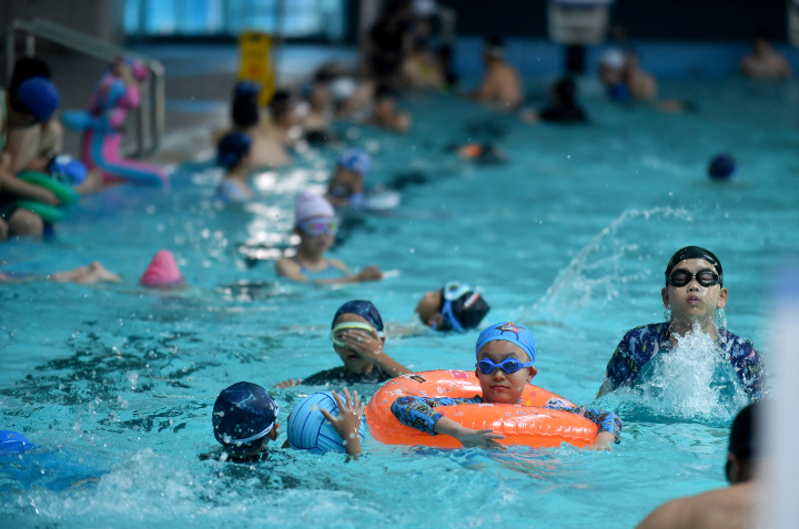 ▲高温天,不少市民在奥体中心游泳馆玩水度夏。