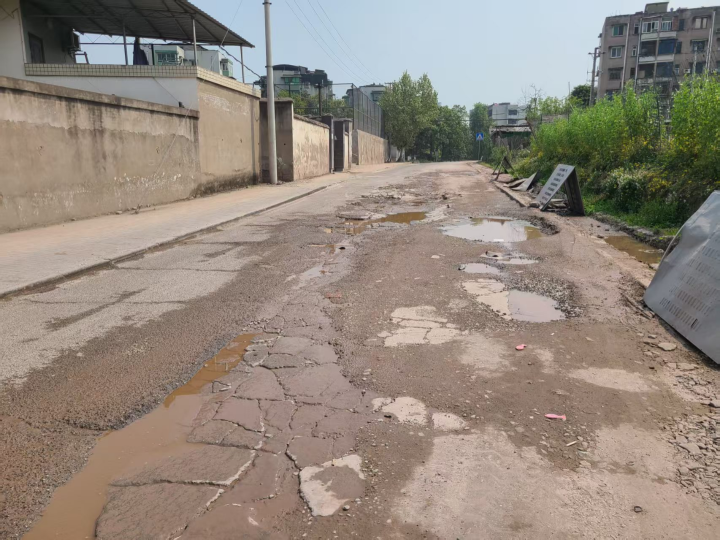 近300米长的窑瓦溪支路,位于西彭镇元通村,是西彭镇连接九龙新城园区及重庆枢纽港北高速收费站的一条近路。由于园区内企业较多,这条路上每天都会驶过装满货物的重型货车。在重车长期的碾压下,大坑小洞像补丁般布满路面,最深的坑洼能没过脚踝。再加上路面排水不畅,每逢雨天,积水便在坑中汇聚成一个个“小池塘”,浑浊的泥水随着车辆驶过四处飞溅,行人稍不留意就会被溅得满身污泥,只能小心翼翼地绕道而行。