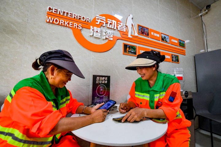 高温下的高强度劳动,对体力和意志都是巨大考验。完成天桥附近的作业后,贺洪会快步走向不远处的“劳动者港湾”。“做累了我们就进来喝口水,歇一歇,还能坐着吹会儿空调。”在这里,环卫工人疲惫的身心,能够得到片刻的放松与舒缓。
