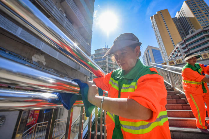 下午4时30分,在直港大道团结路口的天桥上,不锈钢栏杆反射着刺眼的白光,表面滚烫。环卫工人贺洪会和工友们正在埋头忙碌,清扫地面、擦拭栏杆,一系列的麻利保洁后,又立刻钻进街边的绿化带,仔细搜寻、捡拾着藏匿其中的烟头等细碎垃圾,豆大的汗珠不断从额头渗出,滚落。