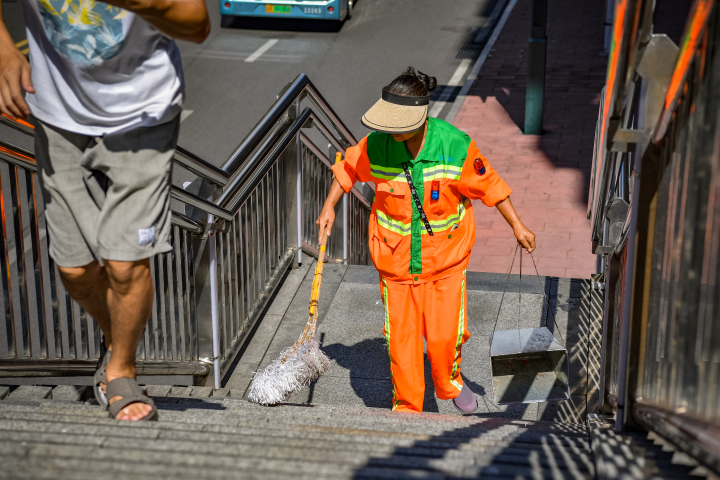 在九龙坡区,像贺洪会这样每日与扫帚、抹布为伴,为街头巷尾“梳妆”的环卫工人,共有近1200名。他们日均步行2万步、弯腰超千次,穿梭在城市的每一个角落,默默“汗”卫着街巷的清爽与整洁,成为炎炎夏日里最动人的风景线。