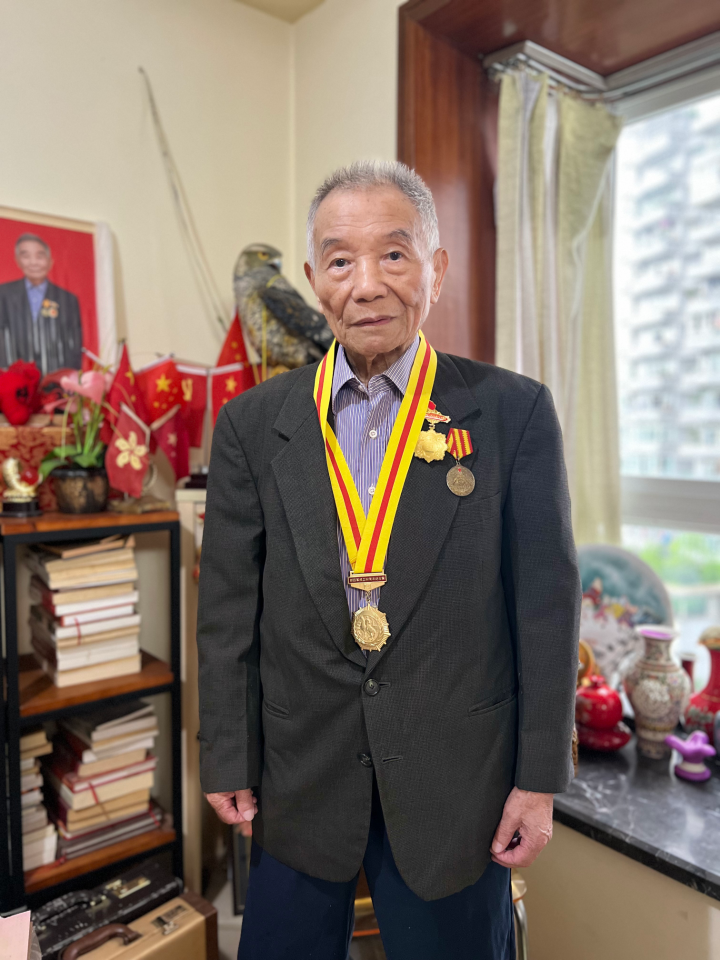 九龙坡区杨家坪街道的一间民居里,95岁的万众一身着熨帖的浅色衬衫,胸前的奖章在阳光下闪着微光。他端坐在沙发上,手指无意识地轻叩膝盖,忽然哼起一段旋律:“冲冲冲,大家来向前冲,怕什么,飞机炸、大炮轰……”