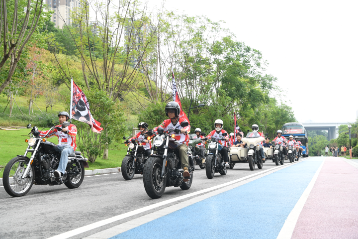 当天下午,彩云谷社区体育文化公园内引擎轰鸣、口号震天,九龙坡区的九龙鑫源熊猫队出征仪式在此举行。13辆摩托车列队成阵,每辆车上飘扬的队旗迎风招展,为这场充满激情的仪式增添了飒爽气场。