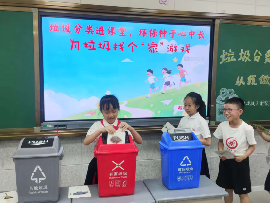 为了让同学们的分类知识更牢固,此次活动还设计了“给垃圾找个家”游戏。只见课桌上摆满了各种“垃圾卡片”,同学们必须根据所学知识要点,把卡片上对应的垃圾进行准确分类,并投放到对应的垃圾桶内。同学们跃跃欲试,分组上阵,争相为“垃圾卡片”找到正确的“家”。