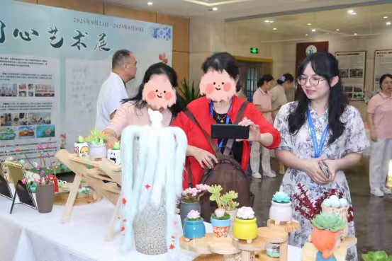 艺术展现场,各展区陈列的精美作品吸引了前来参观的家属和嘉宾。这些色彩丰富、构思独特的画作与手工艺品,均出自中心患者之手。每一件作品都凝聚着创作者的情感与思考,承载着他们对生活的热爱、对自我表达的渴望以及对康复的坚定向往。