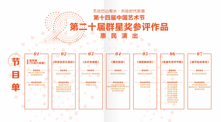 今年,川渝两地首次联合承办第十四届中国艺术节和第二十届群星奖,中国艺术节“群星奖”是艺术的盛会。本次惠民演出不仅是一场文艺的聚会,更是推动优质文化资源直达基层、丰富群众精神文化生活的重要举措。其中,广场舞类首场惠民演出落地九龙坡巴国城生态公园广场,演出汇聚了6支来自江苏、浙江、湖北、湖南、四川、重庆的极具艺术水准与地域特色的顶尖广场舞团队,生动呈现了各地的乡情民貌与文化韵味。市民可欣赏到高水平的文艺作品,沉浸式感受不同地域文化与巴渝风情的碰撞交融,共享群众文化发展成果。