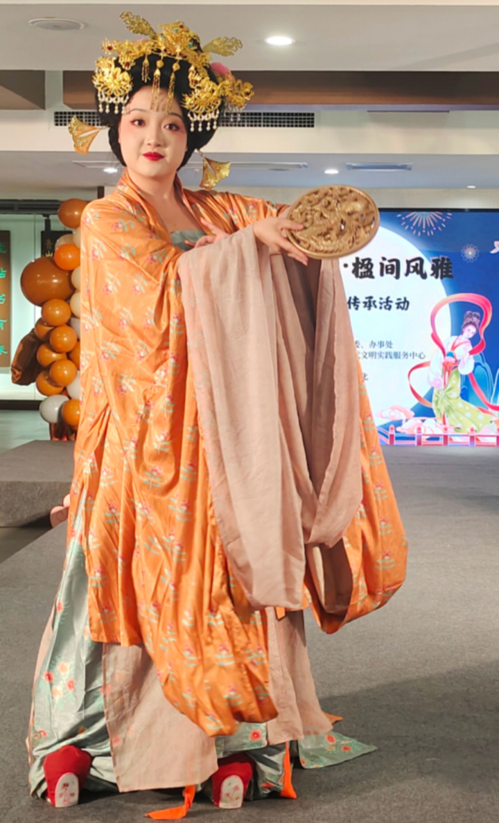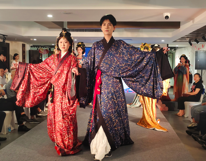 随后,一场精心编排的汉服秀演精彩亮相。模特们身着绣纹精致、形制典雅的汉服依次登场,他们衣袂翻飞如蝶舞,步态轻盈若惊鸿,让传统服饰的古韵之美在现场缓缓流淌。