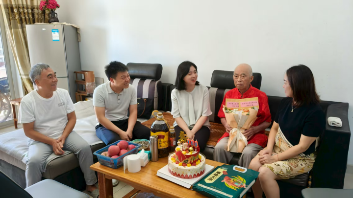 “唐爷爷,祝您生日快乐!”8月26日,石桥铺街道党工委副书记、办事处主任刘佳带领工作人员来到渝州新城社区,为年满100岁的唐爷爷送上生日祝福。一行人将米、油等生活物资,慰问金及定制鲜花、生日蛋糕送到老人手中,围坐在老人身旁陪他唱生日歌、话家常,细致询问老人的饮食起居和身体状况,叮嘱家属悉心照料。温馨的氛围里,唐爷爷脸上洋溢着幸福的笑容。这暖心的一幕,正是街道“特殊定制”养老服务的生动体现。
