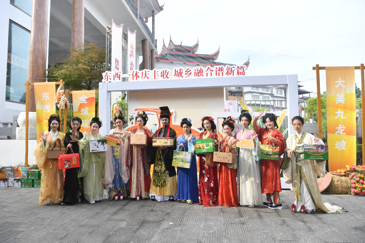 活动现场,九龙坡区农产品区域公用品牌 “品味九农” 正式发布,成为本次丰收节的一大亮点。发布环节通过品牌宣传片、汉服走秀带产品、授牌等形式,全方位展示了10家入选品牌的特色与魅力。