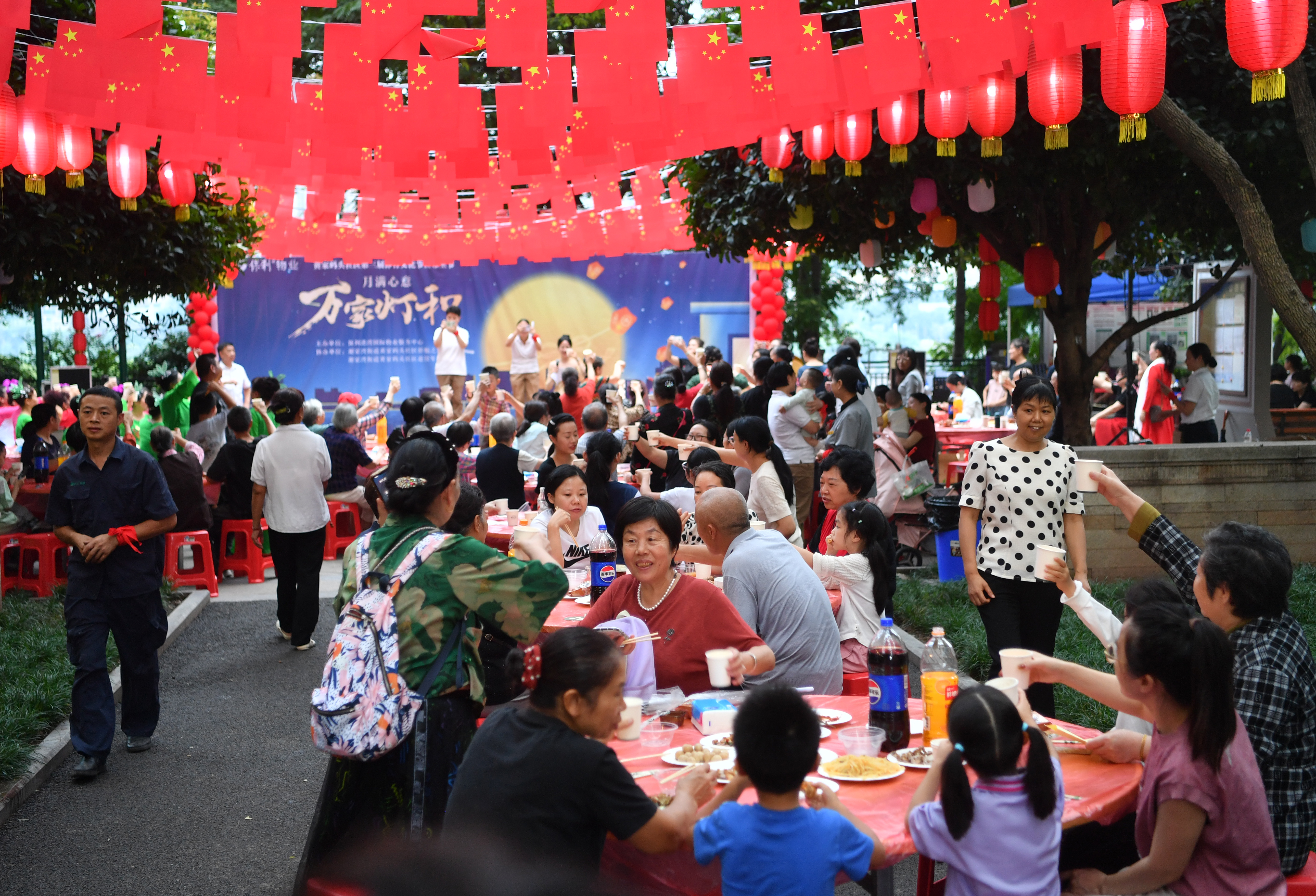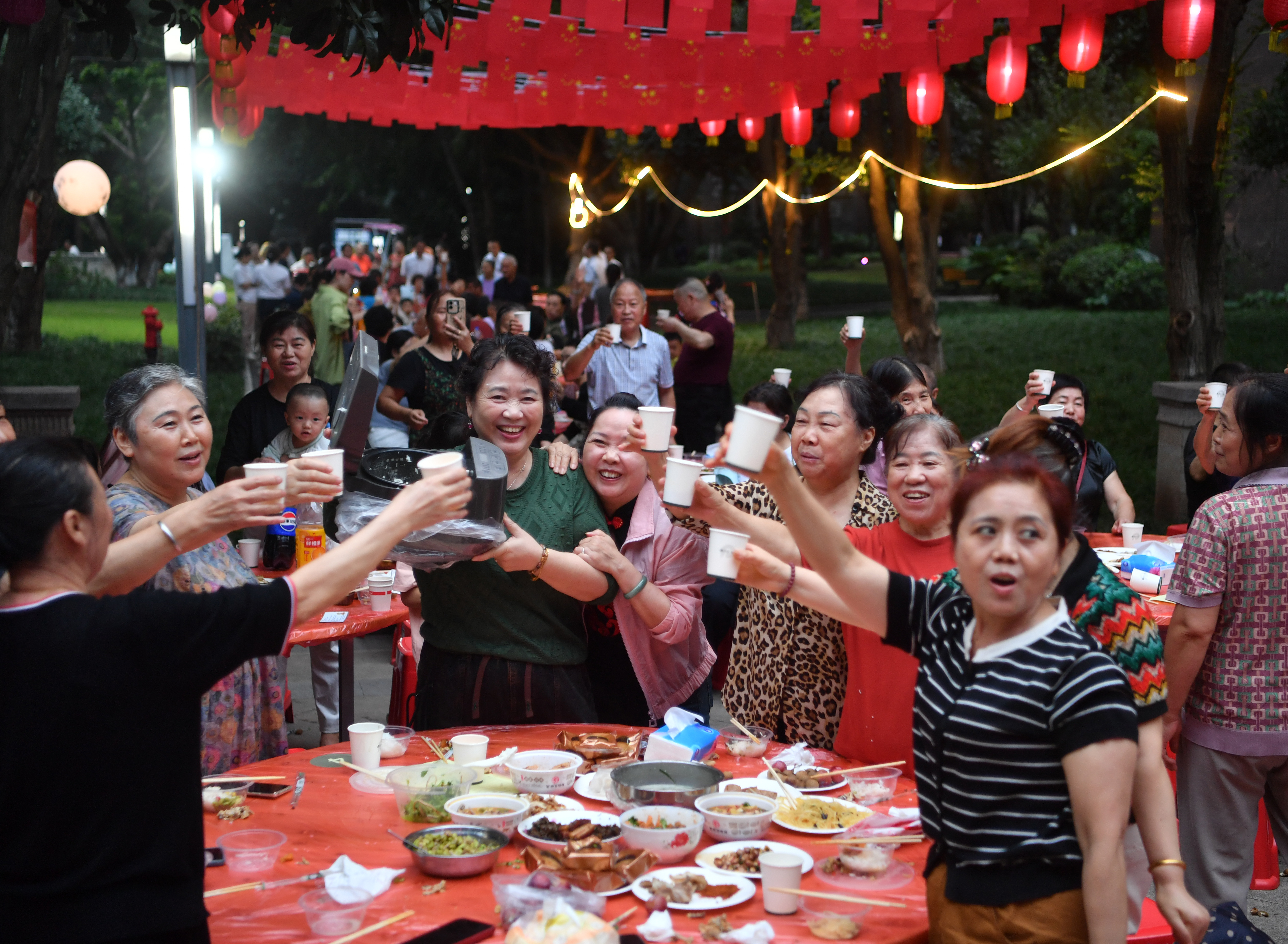 夜幕降临,百家宴成为最动人的风景。居民们端着自家拿手菜陆续入场,粉蒸肉、水煮毛豆、凉拌三丝等佳肴令人垂涎,辖区爱心餐饮企业赵东家、邻家轩也送来了特色菜,再加上月饼、水果,摆满10多张红色大圆桌。与此同时,一场齐聚了小区文艺高手的文艺汇演隆重开幕,原创歌曲、武术表演、舞蹈、乐器演奏、键盘演奏……活动中穿插极具人气的抽奖活动,好不喜庆!