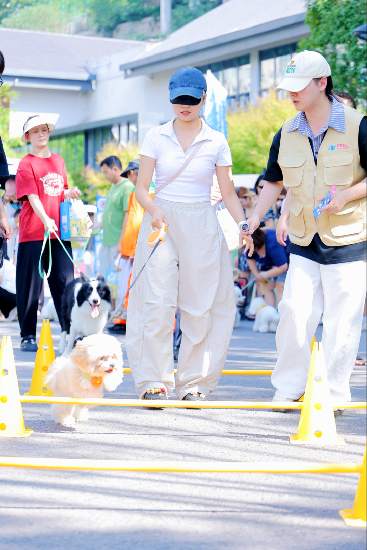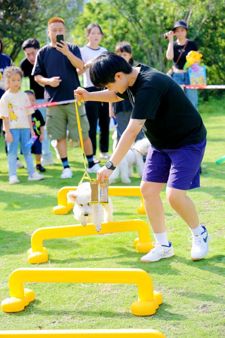 宠物运动会现场堪称 “欢乐源泉”。工作人员按宠物体型划分小型犬、中大型犬赛道,赛道上铺满防滑垫,旁设医疗点——兽医志愿者背着应急包随时待命,安全感拉满。随着主持人一声令下,“运动员” 们各显神通:绕桩项目里,小型犬 “泰迪” 灵活地穿梭在桩间,宠主在一旁轻声引导;跨栏环节中,中大型犬 “金毛” 纵身一跃,稳稳越过障碍,引得观众阵阵欢呼;慢走打卡项目则充满趣味,有的 “毛孩子” 走着走着就停下来 “撒娇”,逗得宠主又笑又无奈,一旁加油的亲子家庭更是举着手机抓拍,温馨的画面随处可见。
