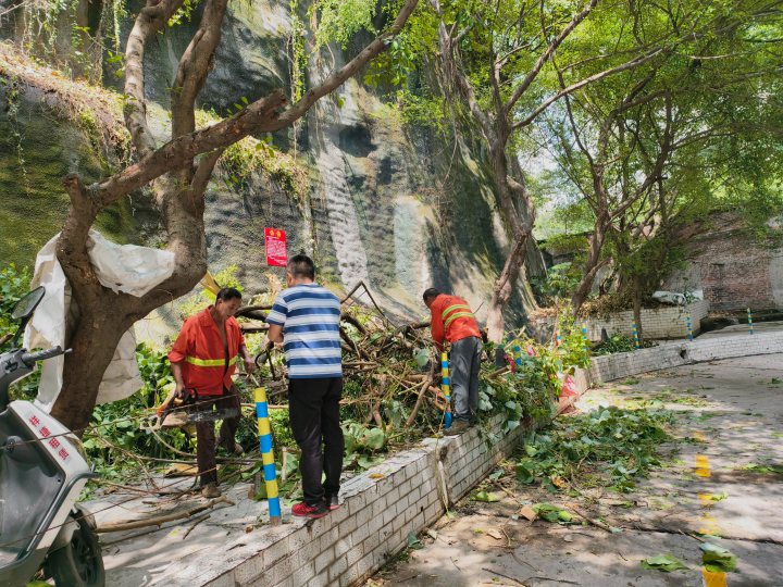 由于白马凼7号老旧小区车辆根本无法驶入,导致常规的人机配合排危施工无法实施。为了消除隐患,白马凼社区多方寻求专业单位意见,经过多次现场勘察并征求居民意见后,制定了全人工高空悬吊分段修砍+登高车在隔壁小区辅助作业的整治方案。经过2天紧张有序地施工作业,终于将白马凼7号边坡上高风险的5棵危树进行了修砍整治。