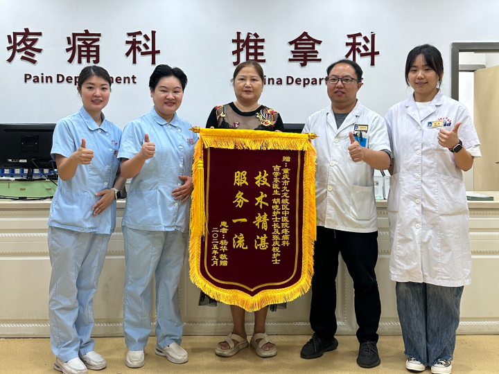 此前,杨华因反复颈肩疼痛伴手麻而深受困扰,生活质量大打折扣。入院后,吉学东医生细致问诊、精准诊断,量身定制治疗方案;胡晓护士长带领护理团队,耐心指导康复训练,时刻关注病情变化;张庆祝护士始终微笑服务,及时回应需求,用热忱与专业给予悉心照料。在医护团队的协作下,杨华症状彻底缓解并康复出院。这面锦旗不仅是对医务人员技术与服务的认可,更成为医患之间深厚情谊的见证,彰显疼痛科“以患者为中心”的服务理念。