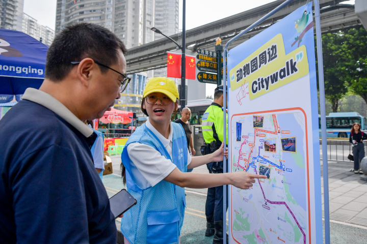 来自杨家坪街道的大学生志愿者和社区网格员,正热情地向过往游客发放宣传折页。“很多游客出了动物园,会有点迷茫,不知道接下来该去哪。我们发放这个折页,就是希望能帮他们无缝衔接下一站,让整个行程更充实、更尽兴。”志愿者一边介绍,一边将折页递给一位带着孩子的女士。
