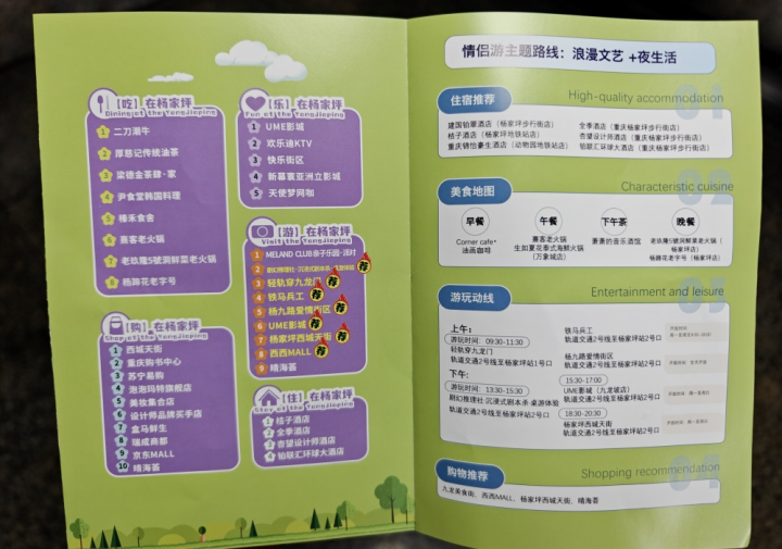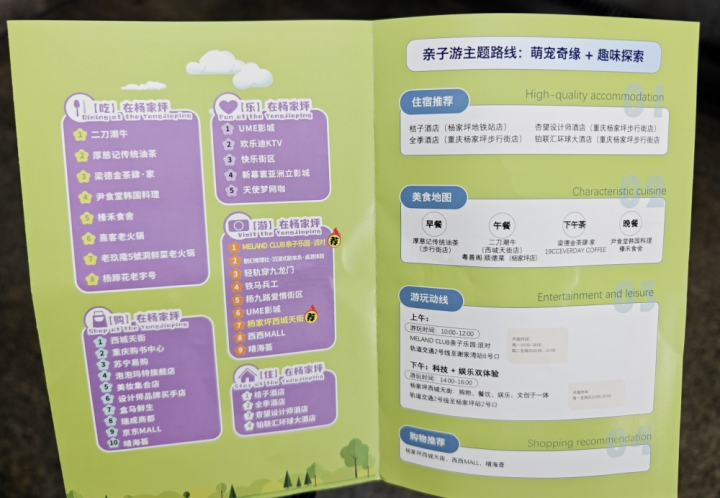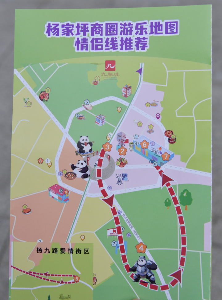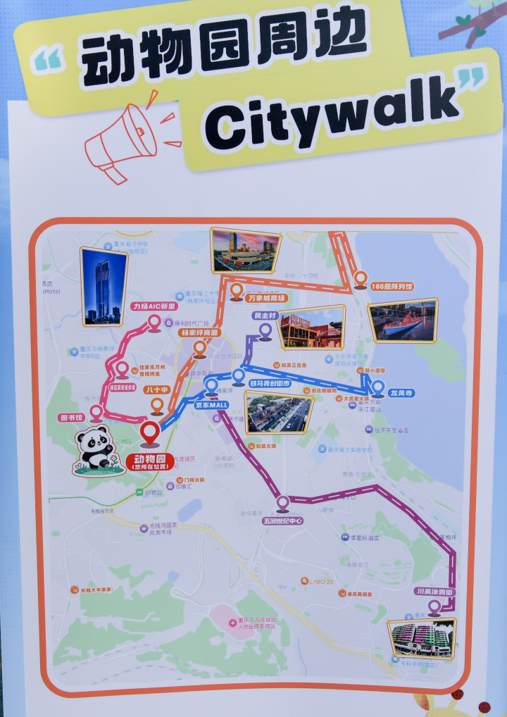 记者发现,这份宣传折页内容翔实,不仅清晰地标注了动物园周边的停车资源,还特别规划了主题游玩路线。其中,杨家坪商圈游乐地图的情侣线推荐囊括了“浪漫文艺+夜生活”的全天候体验:上午可以打卡网红景点“轨道交通穿九龙门”,下午可以体验沉浸式剧本杀或看一场最新大片,漫步杨九路爱情街,购物选择更是丰富多样,从九龙美食城的地道小吃到西西MALL、杨家坪西城天街、晴海荟的时尚购物,一应俱全。此外,折页也为亲子家庭规划了专属路线,确保各个年龄段的游客都能找到自己的乐趣。
