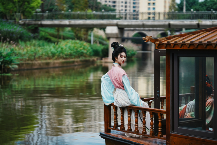 大溪河上,典雅的古风画舫悠然穿行于独善桥至九龙桥水域,成为一道流动的风景。游客可暂别岸上喧嚣,从水上视角欣赏两岸如画的秋日田野与沧桑古桥,感受大溪河的灵动悠远。“从水面看汉式建筑和田野,角度完全不同,心一下子就静了,”来自成都的游客江川一边调整相机一边赞叹,“画舫的倒影与真实的船几乎对称,再配上汉服游客凭栏远眺的瞬间,每一帧都像海报。”