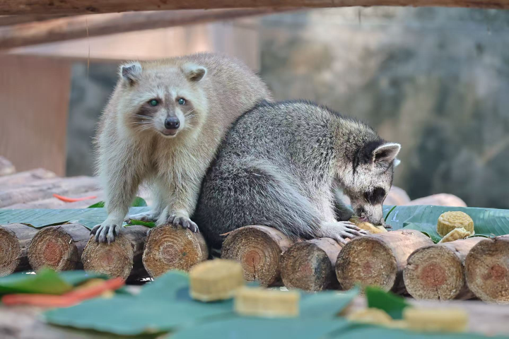 最后一站来到可爱动物区,这里的浣熊收到了 “迷你精致款” 中秋餐。几只浣熊围在小小的食盘旁,捧着专属配方制作的迷你月饼,用灵活的小爪子小口进食,偶尔还会互相 “抢食”,你推我搡间尽显灵动活泼,让游客们忍不住驻足观看,舍不得移开目光。