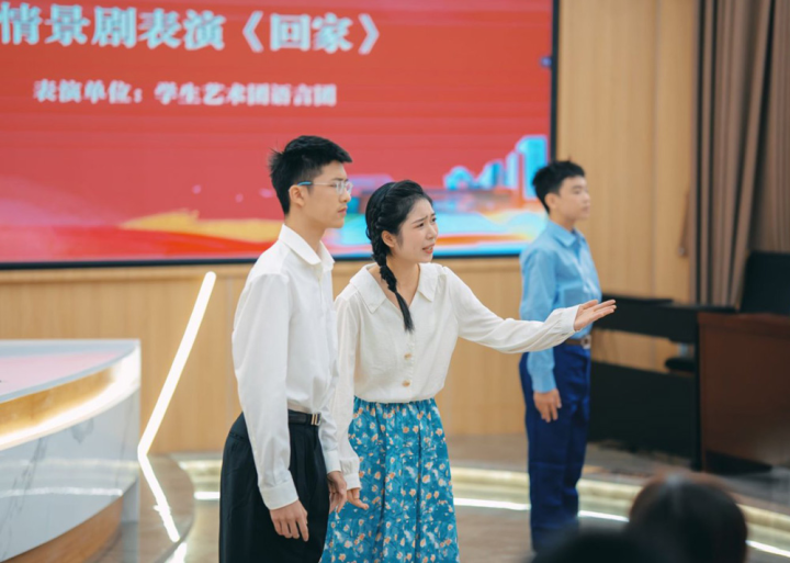当学校语言艺术团演绎根据真实故事改编的情景剧《回家》时,整个会场鸦雀无声,注意力都集中在几位同学的细腻演绎上。当看到俭朴善良、渴望回家的孩子,成长为一名优秀人民警察,牺牲在执行公务途中,再也无法回家,两鬓斑白的父母望穿秋水的场景,激起了现场许多观众的深深共鸣,禁不住潸然泪下,大家对优良家风有了更为感性和直接的理解。