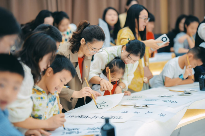 “小手大手,共书廉洁”行知廉洁书法书写体验环节将现场氛围推向了高潮,在笔墨、宣纸的香韵中,桌前围满了亲子家庭。父母们耐心引导,手把手教孩子握笔,从“廉”“洁”二字的起笔、行笔讲起,在纸上缓缓写下笔画,“写字要稳,就像做人要守得住本心”的叮嘱,伴着墨香一同浸润人心。待到完成书法作品,孩子们兴奋地举着宣纸与家长合影,镜头中的笑脸与充满童稚的作品相映成趣,定格下最动人的瞬间。
