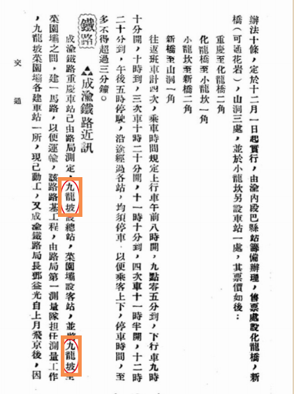 民国25年(1936年)11月,《四川月报》刊载“成渝铁路近讯”,是目前考证资料中首次发现在刊物中报道“九龙坡”。