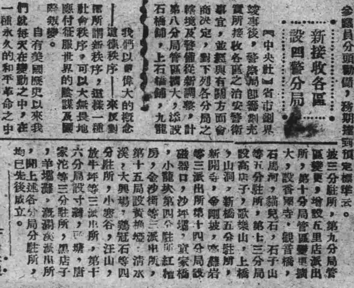 1941年1月12日《新蜀报》报道,“省市划界竣事后,警察局即筹划充实所接收各区之治安警卫事宜”“添设石桥铺,上石桥铺,九龙坡三分驻所”,是目前考证资料中首次发现在报纸中报道“九龙坡”。