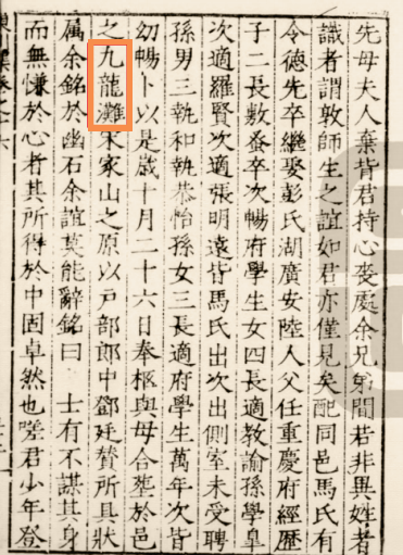 据考证资料推测,“九龙滩”地名出现于明代正德前。目前考证到最早出现“九龙滩”地名的文学作品是本地人刘春(1460—1521)的《东川刘文简公集》卷16《明故甘泉尹李君(垚)墓志铭》“(垚次子)畅卜以是岁十月二十六日奉柩与母合葬于邑之九龙滩宋家山之原”,作于明武宗正德十三年(1518年)。