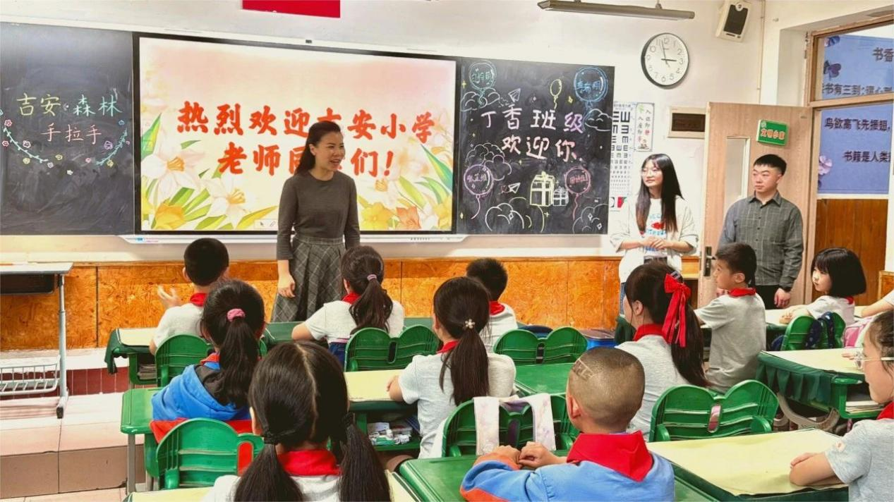2025年4月,在刘珺老师和丁香班级家委会的努力下,吉安小学的师生代表第一次走进森林小学,开展了一周“共读共学”活动。孩子们一起上语文课、做科学实验,一起在操场跑步,吉安小学的老师也跟着听课、交流教学经验。刘珺说:“我就是想让乡村的孩子多看看外面的世界,也让城里的孩子学会感恩。”