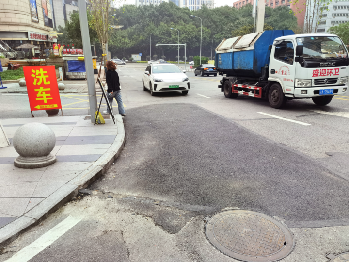 附近居民向社区反映,当时出门需要绕行,门口原本的两车道变成了单车道,车辆进出容易造成拥堵,路过车辆稍不注意就会造成擦挂,路人过马路踩到破损路面可能会扭伤。