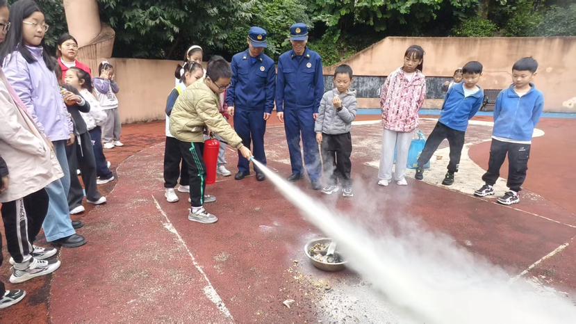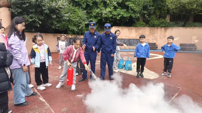 在实践环节,消防队员演示了灭火器的正确使用方法,"记住'提拔握压'四字口诀!"随后,在消防员指导下,孩子们分组开展油盆灭火实操,让所有孩子“零距离”体验消防。