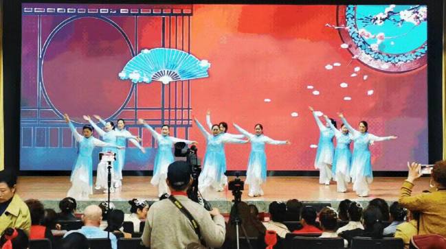 演出现场,百余位银龄表演者精神矍铄、妆容精致、服饰华美。伴随着《梅花赋》的婉转旋律,她们以整齐的动作、生动的表情和流畅的队形变换,将戏曲的典雅与舞蹈的动感完美融合,赢得现场观众阵阵掌声。