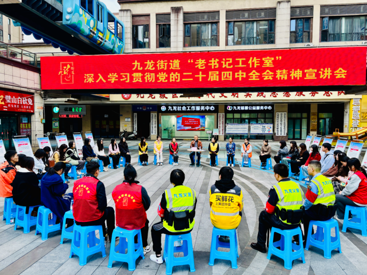 九龙融媒讯(记者 范坤民)11月13日,九龙街道“老书记工作室”走进九龙社会工作服务中心、九龙街道慈善公益服务中心,以院坝会的形式传达学习贯彻党的二十届四中全会精神,社区社工室、社会组织、志愿服务队的近50名专业社会工作者和志愿者代表参加。