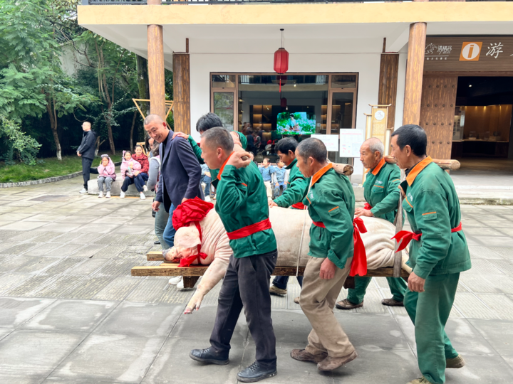除了味觉盛宴,一系列沉浸式活动让年味更具参与感。满足40人以上参与条件即可开启“猪王巡游”,抬着年猪敲锣打鼓穿行场地,仪式感拉满;“感恩山川”主祭仪式简洁庄重,5分钟内的祭文诵读,传递对自然馈赠的感恩与来年顺遂的祈愿。趣味十足的“飞镖夺猪”游戏中,游客在3米射靶前一展身手,射中不同位置可赢取龙骨、猪头肉、里脊等对应部位的土猪肉,将“龙马精神”“鸿运当头”等美好寓意带回家。