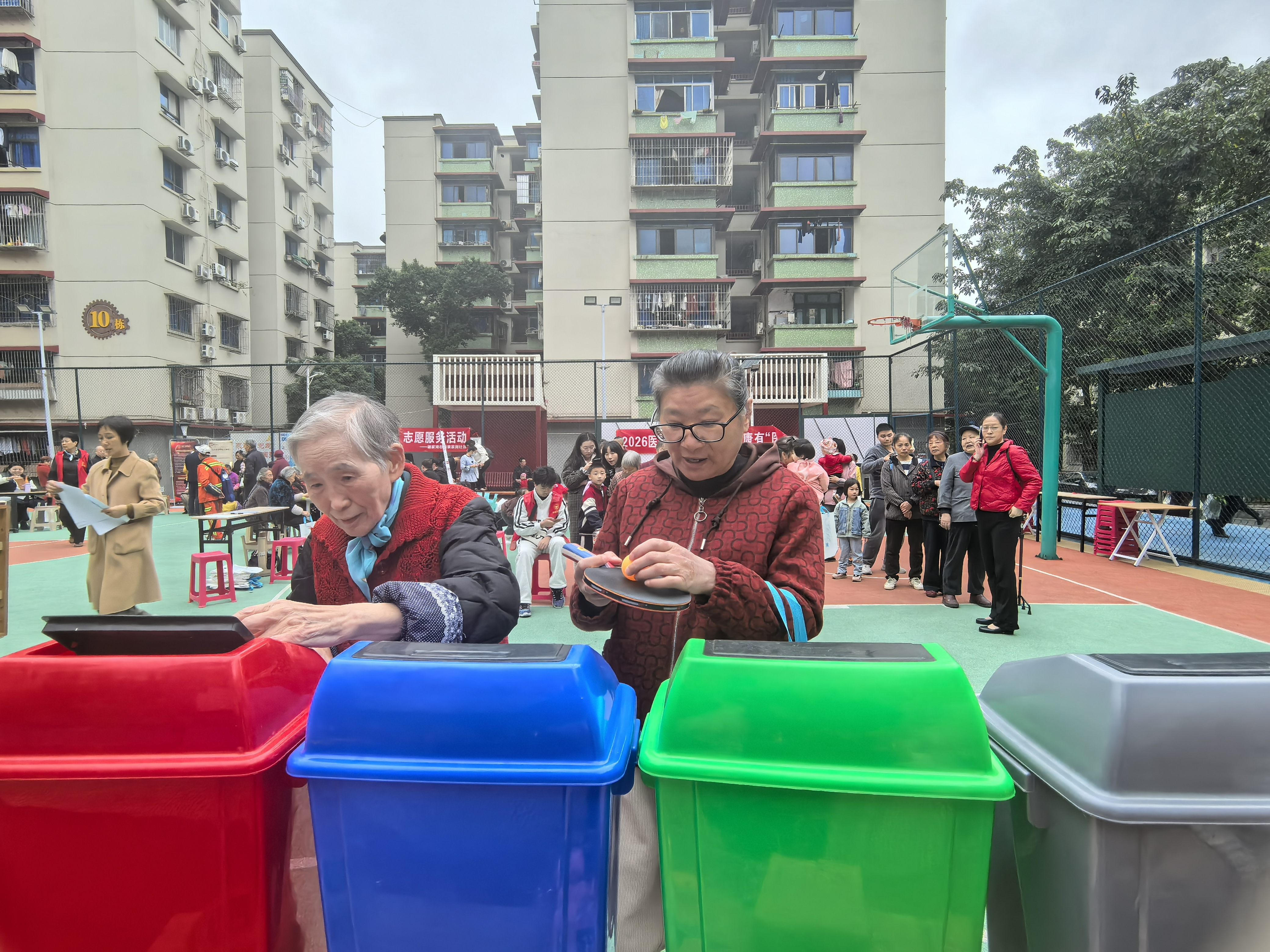 趣味运动中,“请垃圾回家”环节最受居民欢迎,跃跃欲试的居民排起长队,参赛者需手持写有“废电池”“外卖盒”“旧书本”等不同垃圾名称的乒乓球,在规定时间内奔向对应的四色分类垃圾桶,只有投放正确,才能获得小礼品。“快把‘剩菜剩饭’投进绿色厨余垃圾桶!”只见一旁的居民们比参与者还紧张,加油声、提醒声、欢呼声交织在一起,让原本严肃的垃圾分类知识变得鲜活有趣。
