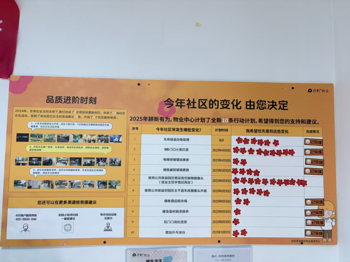 第三步,清单上墙,挂图作战。确定的“十大民生行动”被制作成醒目的“计划清单表”悬挂在物业服务中心墙上。每一项都明确了项目内容、负责人、计划完成时间和当前进度。