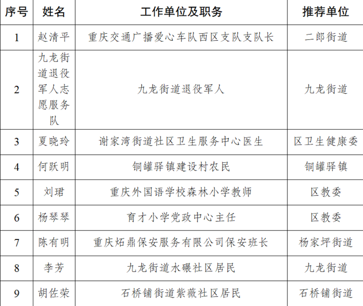 为大力培育和践行社会主义核心价值观,发挥先进典型在公民道德建设中的示范引领作用,根据《重庆市九龙坡区“九龙好人”推荐评选办法(试行)》相关要求,区委宣传部开展2025年第二批“九龙好人”评选活动。
