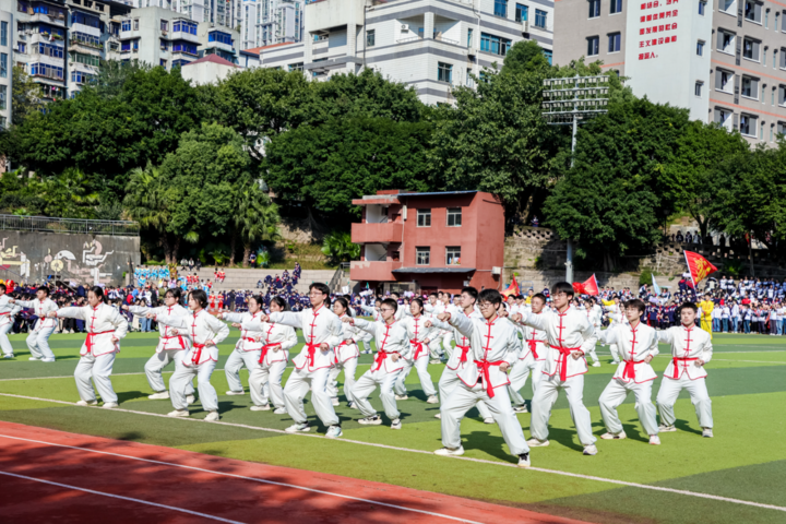 九龙融媒讯(记者 廖婉廷)当京剧的水袖拂过绿茵场,当安塞腰鼓的鼓点震彻校园,当龙狮的矫健身姿与少年的奔跑身影交叠——11月19日下午,重庆市铁路中学A区足球场上,一场非遗与体育共生、传统与青春碰撞的盛会正式启幕。该校第54届星光体育文化嘉年华以“非遗古韵焕彩,青春星潮澎湃”为主题,打破传统校园体育活动边界,将中华优秀传统文化的深厚底蕴与体育精神的活力锋芒深度融合,成为学校“和美发展,群星灿烂”育人理念的生动注脚。