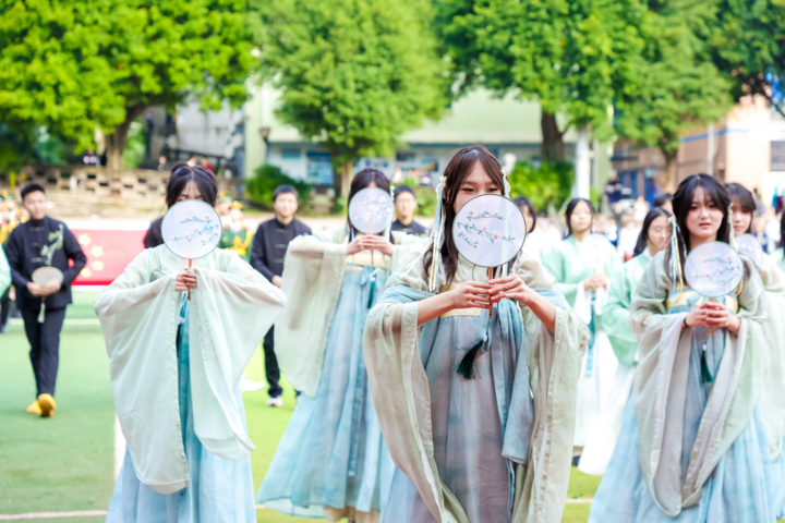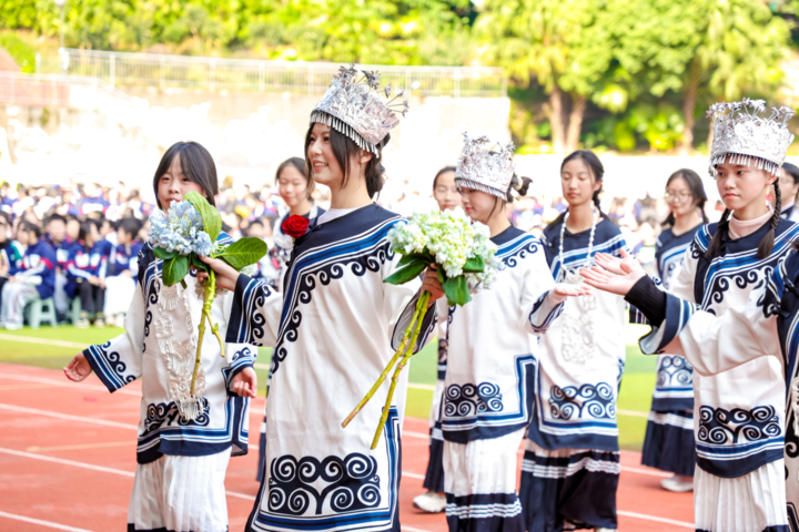不同于常规的入场仪式,铁路中学校级领导班子以非遗剧目角色惊艳亮相,用“沉浸式演绎”开启文化传承的对话。入场式环节,铁路中学教共体方阵和各年级的非遗展示方阵更是一场流动的“传统文化展”。其中,初一年级的江南折扇让扇面如“流动的画卷”,皮影戏道具与龙舟模型相映成趣;高一年级的侗族大歌合唱与黄梅戏呈现出不同魅力,展现非遗的多元形态;高二年级的安塞腰鼓方阵鼓声震天,与越剧小生的水袖表演形成“刚与柔”的奇妙对话;初二年级的春联书法方阵,学生们一边展示手写春联,一边以剪纸纹样排列队形,让笔墨香与剪刀下的匠心,在运动场上勾勒出非遗的鲜活模样。这些并非简单的“元素堆砌”,而是学子们对非遗内涵的理解与转化——当中医推拿按摩的养生理念融入拉伸动作,当中药香囊的制作技艺成为方阵装饰,非遗不再是博物馆里的“标本”,而是能触摸、能演绎、能热爱的“生活文化”。