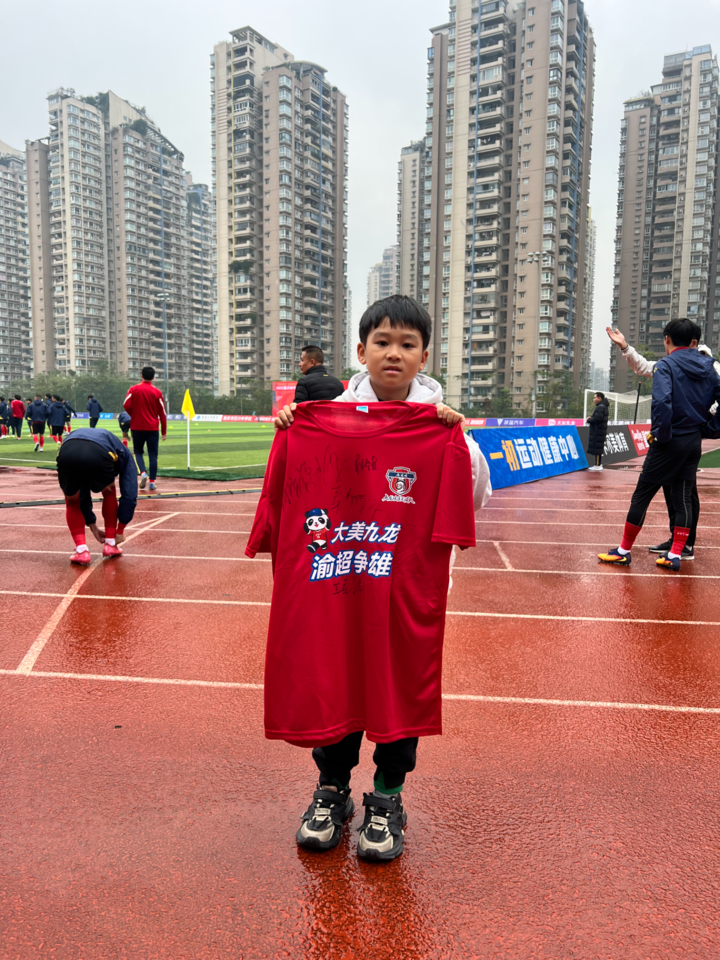 九龙融媒讯(记者 范坤民 摄影报道)11月22日,渝超联赛九龙鑫源熊猫队客场对战两江信也科技队的比赛,在石子山体育公园火热开赛。赛场边,一抹稚嫩的身影格外显眼——来自九龙坡区华玉小学校四年级的学生刘中一,在妈妈的陪同下专程赶来,只为给支持的球队球员肖宏博加油。