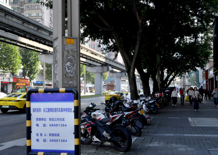 另外,针对摩托车停放乱象,街道还制作并设置了48个摩托车停车位提示牌,在商圈周边、医院门口、学校附近等区域划设专属停车泊位,引导摩托车规范停放。