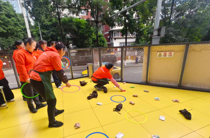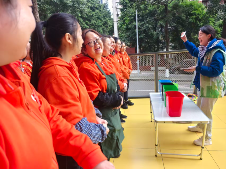 套圈区域摆放着环保袋、可降解垃圾袋、围裙等实用礼品,吸引大家踊跃参与。“这个塑料饭盒应该投到其他垃圾桶里”“过期药品是有害垃圾,要放红色桶……”现场讨论声、欢声笑语不断,大家在游戏中加深了对垃圾分类知识的理解。志愿者们也在一旁及时解答疑问,对容易混淆的垃圾进行细致讲解,确保垃圾分类知识入脑入心。