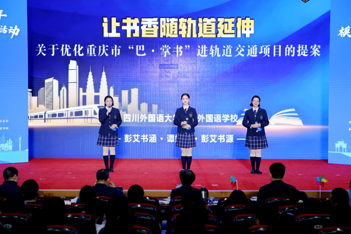 九龙融媒讯(记者 范坤民)11月18日下午,2025年重庆市青少年模拟政协提案征集活动决赛展演在沙坪坝区区级机关礼堂举行,九龙坡区选送的提案作品《关于优化重庆市“巴·掌书”进轨道交通项目的提案》(四川外国语大学附属外国语学校高2028届1班谭嬿妮、彭艾书源、彭艾书涵三位同学共同撰写)凭借扎实的调研、精准的分析和可行的建议,以全市得分排名第一的优异成绩荣获金奖,用青年智慧为城市文化建设注入鲜活力量。