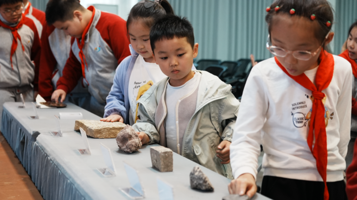 重庆自然博物馆张锋副馆长等专家化身“古生物向导”,用孩子们听得懂的生活化语言拆解专业知识:从“重庆亿万年前曾是一片汪洋,恐龙如何在这里繁衍生息”的地质演变故事,到“澄江渝州上龙如何在远古水域称霸”的趣味讲解,再到化石形成的“时间魔法”和古生物保护的重要意义,每一个知识点都搭配着生动的案例和图片,牢牢吸引着同学们的注意力。实物展示环节中,三叶虫、角石、恐龙化石等珍贵标本被一一摆上展台,同学们排着长队亲手触摸这些“远古馈赠”,感受化石表面的纹路与质感,不少孩子惊叹道:“原来亿万年前的生物留下的痕迹,摸起来这么奇妙啊!”