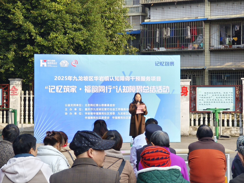 九龙融媒讯(记者 范坤民)为系统呈现认知障碍项目实施成效,深化社区居民对认知障碍服务的认知,构建全方位社区支持网络,11月27日,“记忆筑家・福韵同行” 认知障碍总结活动在华福雅苑社区举办。本次活动由北京韩红爱心慈善基金会提供公益支持,重庆市九龙坡区爱行社会工作服务中心具体执行,重庆市九龙坡区精神卫生中心、华岩镇华福雅苑社区联合协办,社区全体居民踊跃参与,共赴这场温暖与知识兼具的盛会。