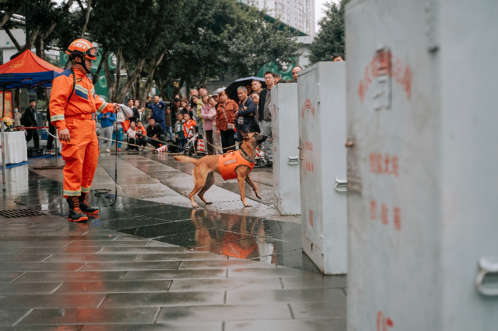 初冬的重庆动物园暖意融融、人气爆棚。启动仪式上,不到两岁的消防搜救犬“丢丢”一亮相便成为全场焦点,在训导员的专业引导下,依次完成服从科目、障碍穿越和箱体搜索演练,矫健的身姿与精准的动作赢得阵阵欢呼。更具互动性的是,市民在安全防护下与“丢丢”玩起捉迷藏,亲身体验箱体搜索乐趣,在轻松愉快的氛围中直观感受消防搜救犬的专业素养与救援价值。