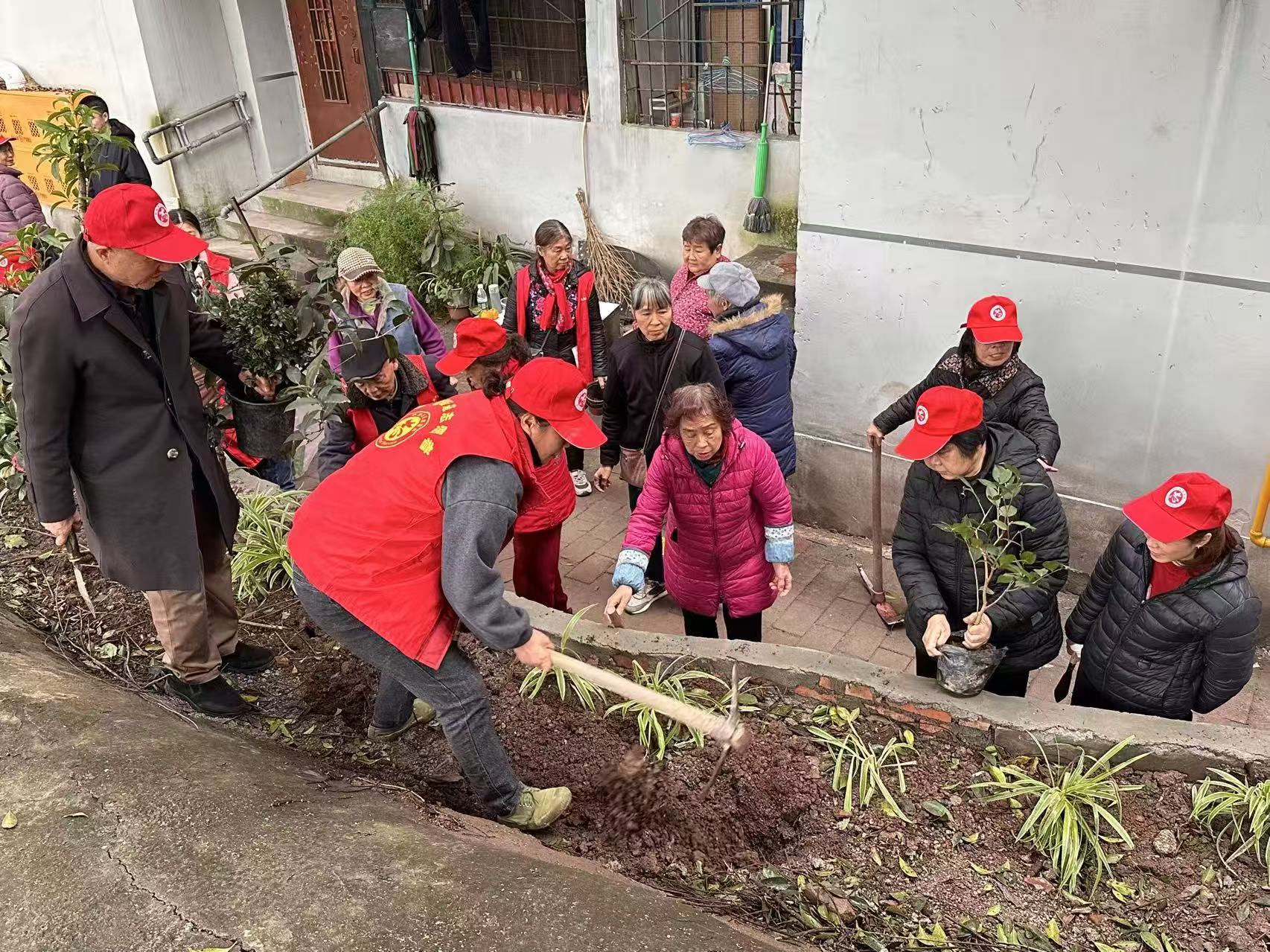 茶话会一结束,大家便迅速行动起来,扛着锄头、拎着铲子来到改造现场。社区种植能手刘尙林师傅早已蹲在花台边规划布局,见人到齐便立刻开启“现场教学”:“三角梅、茉莉爱晒太阳,得种在南边;吊兰、腊梅耐阴,放北边合适”“高的植物往后排,矮的往前摆,看着才整齐”,一边说还一边示范挖坑的深浅,反复叮嘱“坑挖小了根展不开,挖深了容易烂根,刚好能放下花钵最稳妥”。