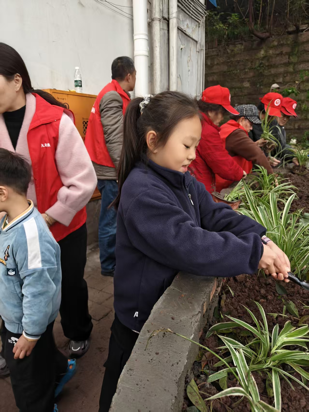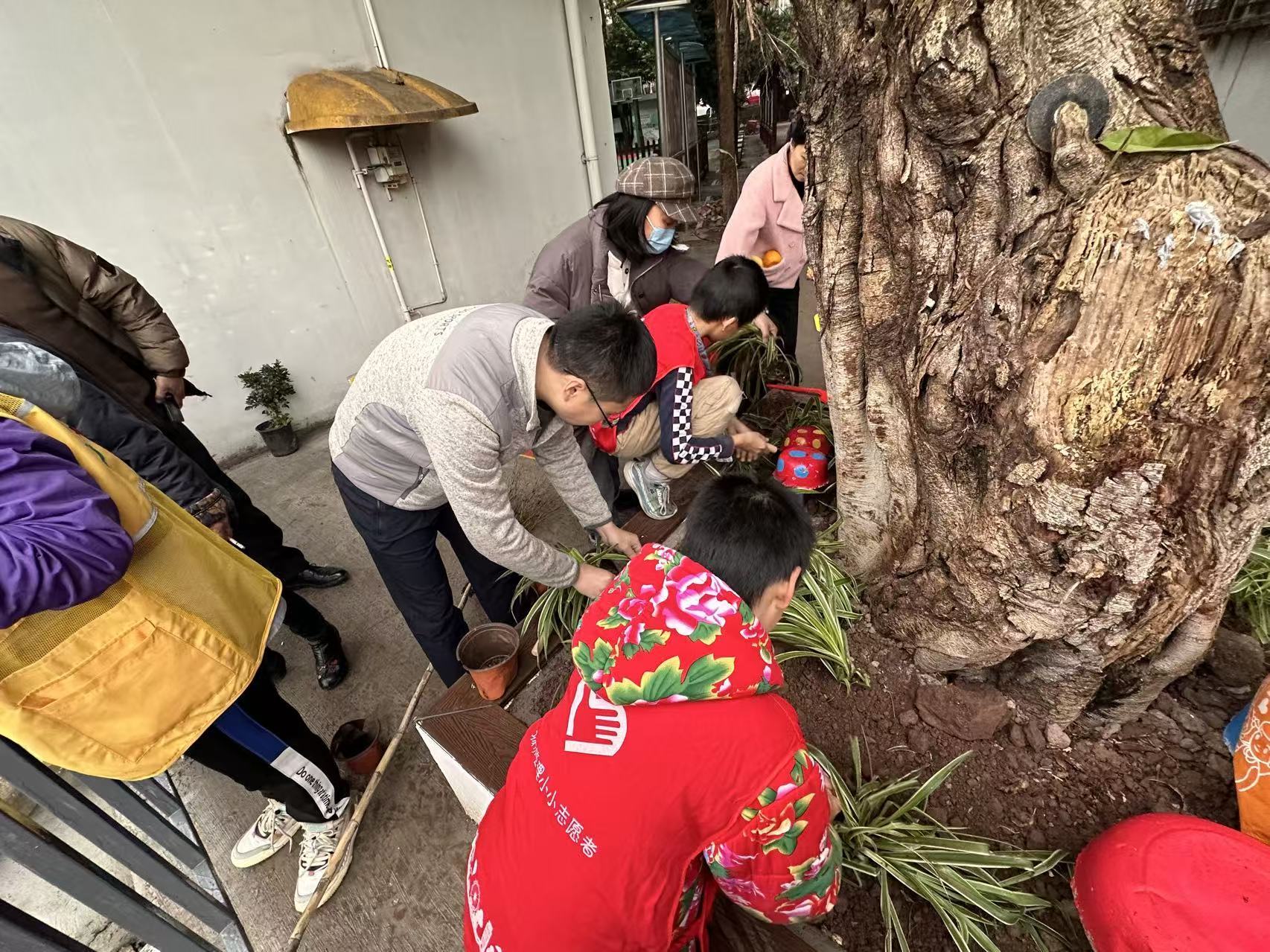 志愿者们迅速分工协作,年轻力壮的小伙子抡起锄头挖坑松土,动作麻利有力;稍微年长者则小心翼翼地从花钵里取出花苗,轻轻梳理根系,生怕伤到娇嫩的植株;刚从牟孃孃家挖来的大铁树被大家合力抬到边坡中央,在刘师傅的现场指导下完成种植。