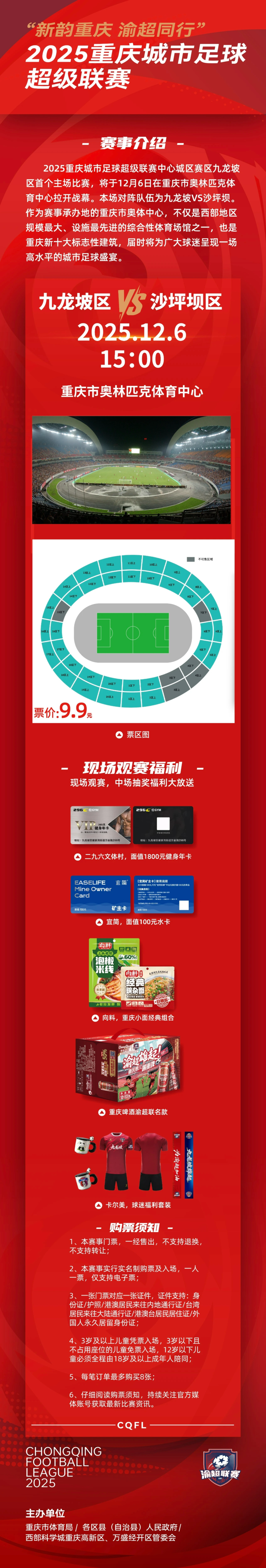 为让更多球迷亲临现场见证这一重要时刻,赛事门票已于12月1日15:00在大麦平台正式开售,单张票价仅9.9元。亲民的价格搭配重磅赛事,成为冬日里重庆球迷不容错过的体育盛宴,目前门票正火热抢购中,球迷需抓紧时间锁定观赛席位。